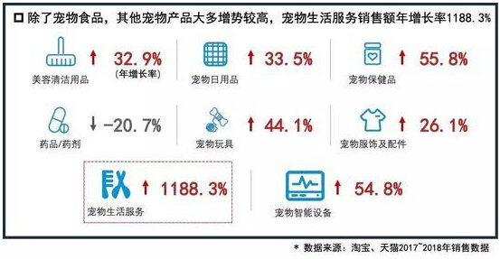 除了宠物食品,其他宠物产品如宠物美容清洁用品、宠物日用品、宠物保健品、宠物玩具、宠物服饰及配件、宠物生活服务、宠物智能设备等销售额均在增长。其中,宠物生活服务增长甚至达到1188.3%。